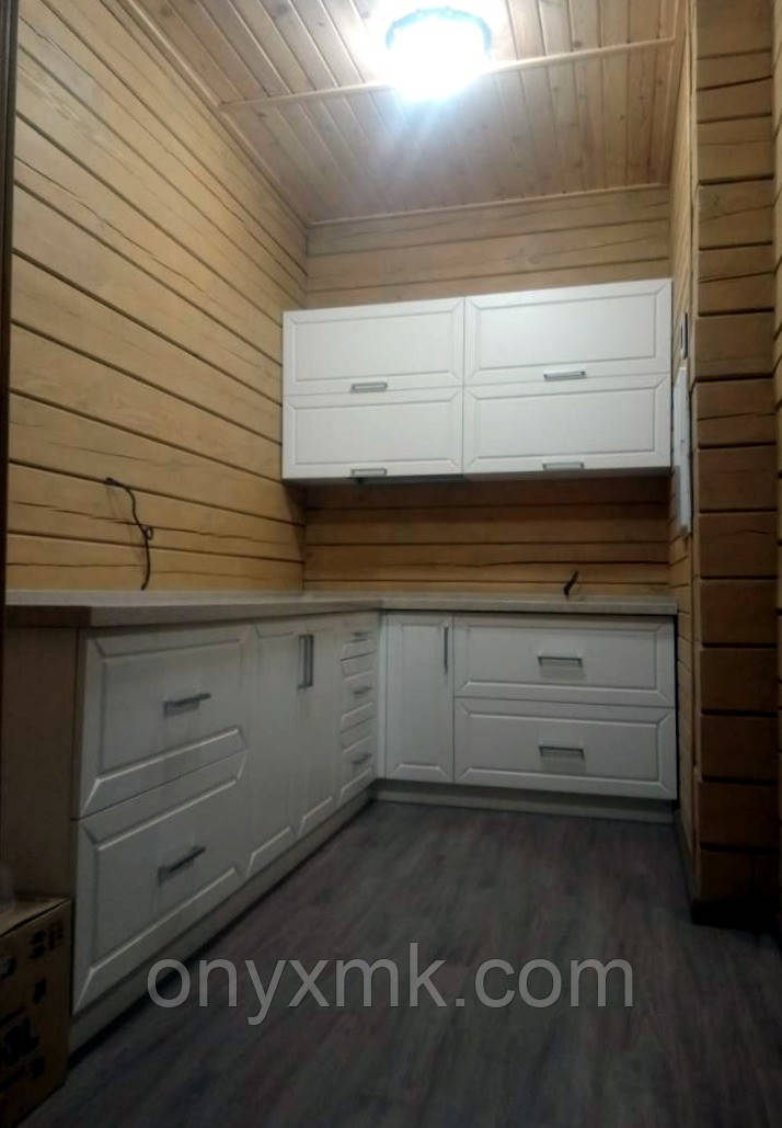 Кухня встановлена в приватному дерев'яному будинку. Фасади виготовлені з фрезеруванням під стати дерев'яним, перевага фрезерованих фасадів, порівняно дерев'яних, у тому, що з часом вони не розсихаються й не змінюють свій розмір.